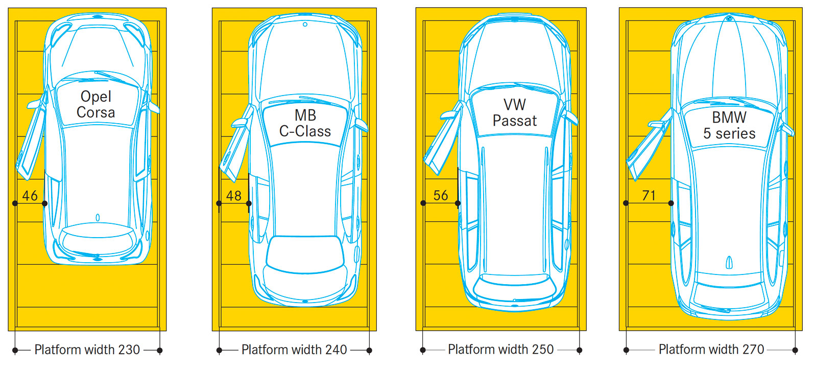 Com o mercado automóvel a desenvolver-se e a tornar-se mais exigente, trabalhamos diariamente para nos adaptarmos e acompanhar estas mudanças. Com. Isto em mente, e tendo em conta os modelos de grandes dimensões, oferecemos soluções de sistemas de parqueamento automóvel para veículos até: 3m de largura; com uma capacidade até 3200kgs; e um comprimento máximo até 6,20m.