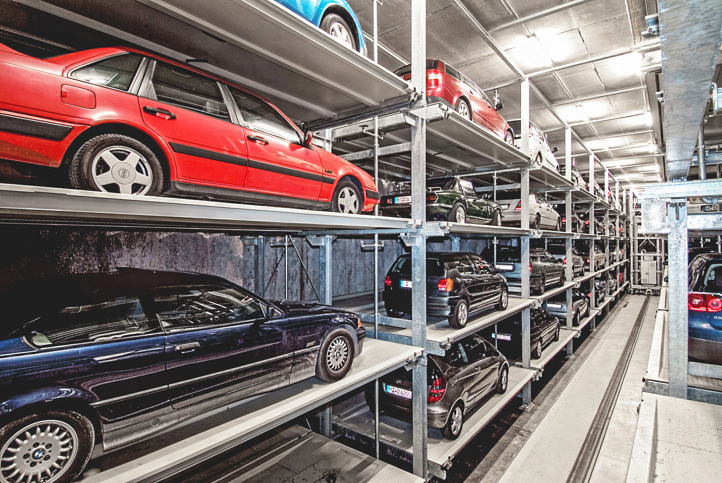 A configuração otimizada do sistema apresenta até 3 filas de estacionamento à direita e à esquerda do sistema de armazenamento e recuperação, e até 8 níveis de estacionamento empilhados uns em cima dos outros. É possível uma disposição personalizável da área de transferência.